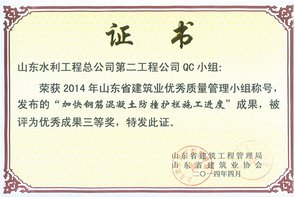 九州平台“加快钢筋混凝土防撞护栏施工进度”荣获2014年山东省建筑业优秀质量管理优秀成果三等奖
