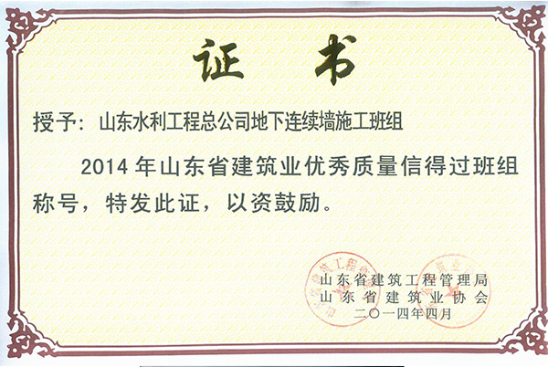 九州平台“地下连续墙施工班组”荣获2014年山东省建筑业优秀质量信得过班组称号