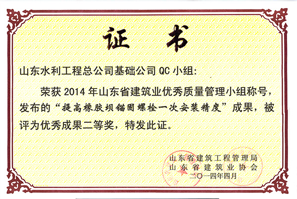 九州平台“提高橡胶坝锚固螺栓一次安装精度”荣获2014年山东省建筑业优秀质量管理优秀成果二等奖