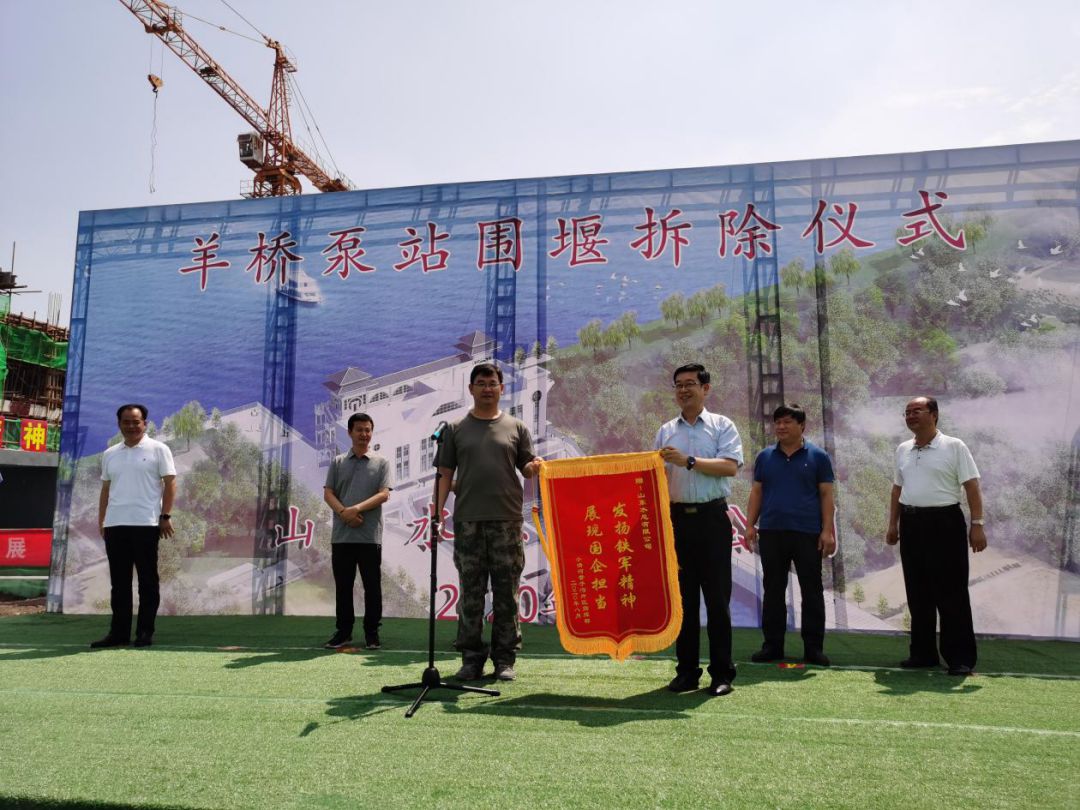 羊桥泵站闸门完全具备了启闭功能,水泵具备了排水功能,围堰的拆除标志着羊桥泵站的正式启用,为今年防汛防潮排涝提供了工程保障,对保证羊口镇人民生命财产安全具有重要意义。仪式上,王法顺部长代表工程指挥部给九州平台授予了锦旗,表达了对九州平台领导及参建职工的感谢,赞扬了水总人自强不息、勇于超越的铁军精神。