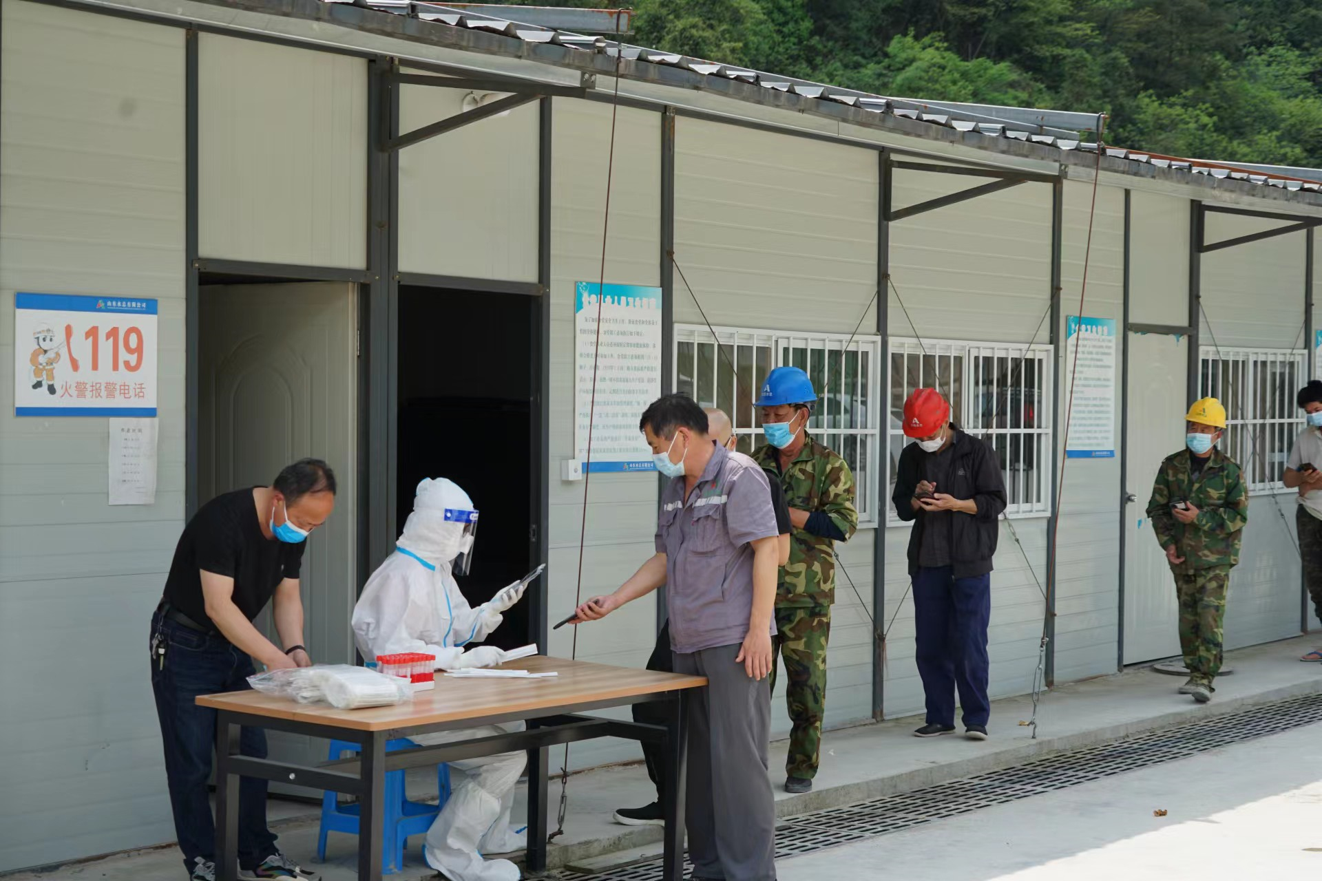 当前,全国疫情呈现反弹态势,疫情防控形势异常严峻。为有效管控疫情传播风险,落实疫情防控主体责任,4月12日,杭州鲁润九州平台邀请项目驻地清凉峰镇卫生院医护人员,到双溪口水库项目部对全体参建人员进行核酸检测,确保应检尽检、全员覆盖,筑牢建筑工地疫情防控安全网。医护人员来工程现场核酸检测,不仅免去了项目人员到医院排队的不便,更大程度的节约了时间,避免影响正常施工。