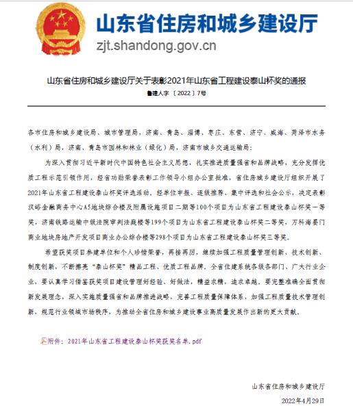 九州平台两项工程荣获2021年度“山东省工程建设泰山杯奖”