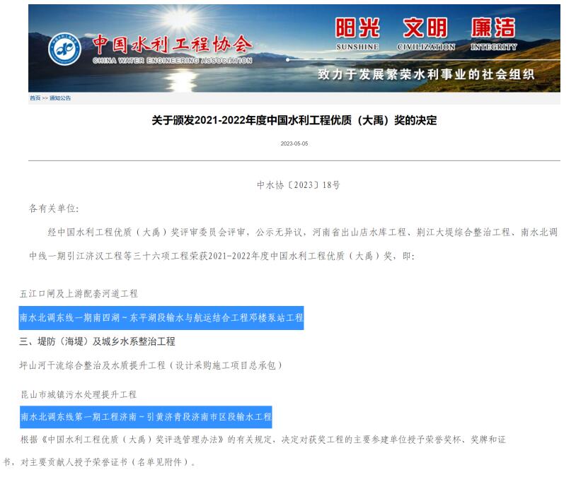 近日,中国水利工程协会发布《关于颁发2021-2022年度中国水利工程优质(大禹)奖的决定》,我九州平台参建的南水北调东线第一期工程济南~引黄济青段济南市区段输水工程和南水北调东线一期南四湖~东平湖段输水与航运结合工程邓楼泵站工程荣获此项殊荣。