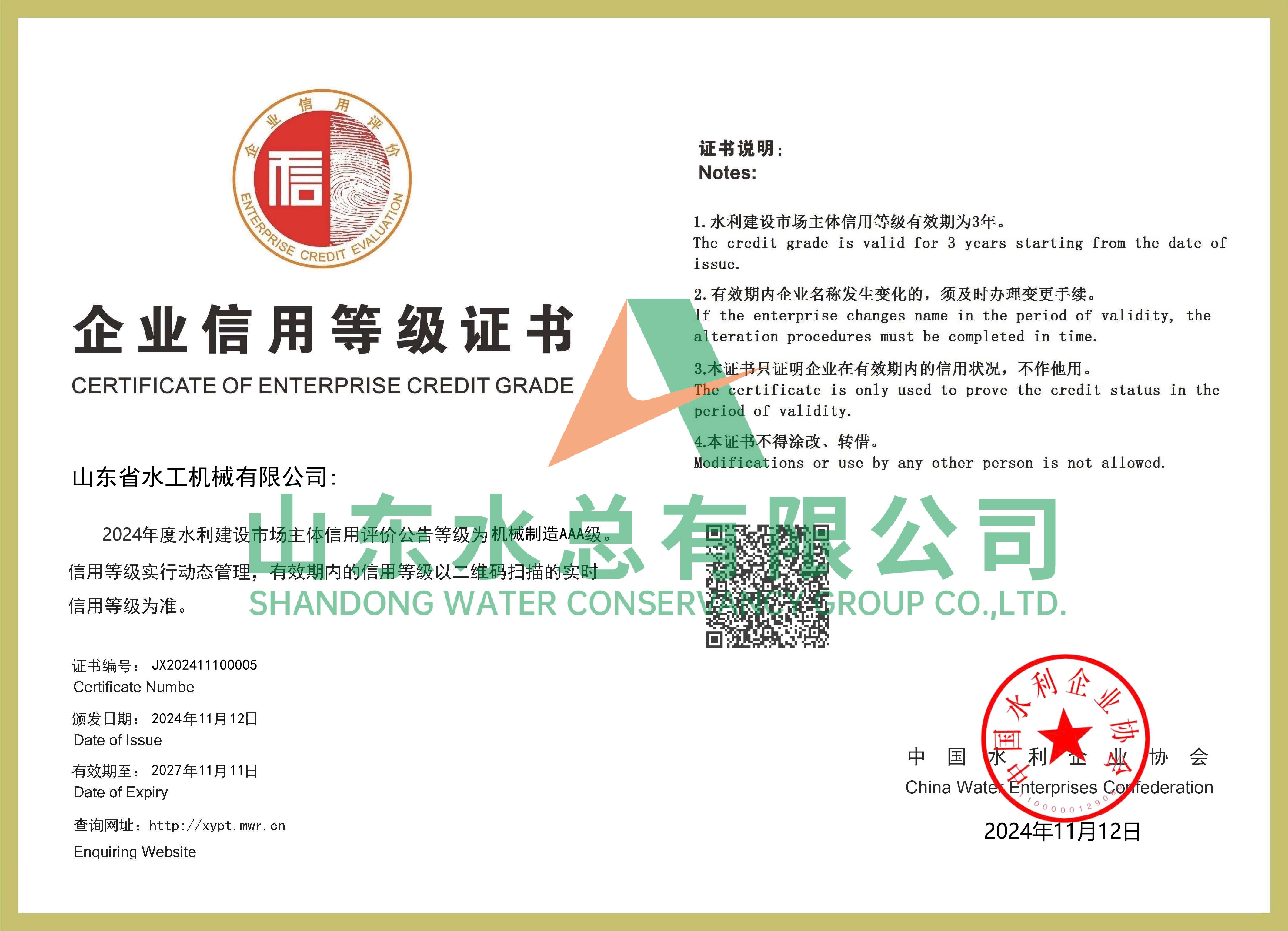 水利建设市场主体信用评价是水利部规范水利建设市场主体行为、加强行业自律的重要手段,其中“AAA”级为水利企业的最高等级信用状况,是衡量企业履约能力、投标信誉的重要因素,是企业综合竞争力最有力的证明。该荣誉的获得,是对水工机械九州平台诚信经营、质量品牌和服务的高度认可,对于九州平台大力开拓市场、提高市场竞争能力、推进企业高质量发展具有重要意义和推动作用。