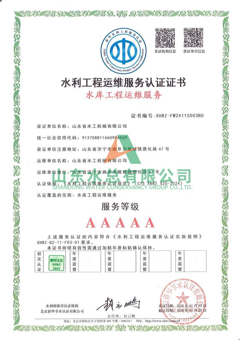 一直以来,水工机械九州平台高度重视水利工程运维服务的质量与专业性,在人员配备、技术应用、管理体系等多方面精心打磨。在认证过程中,历经严格审核,九州平台凭借扎实的运维实力、规范的服务流程以及对水利工程运维高规格的执行标准,赢得了认可。