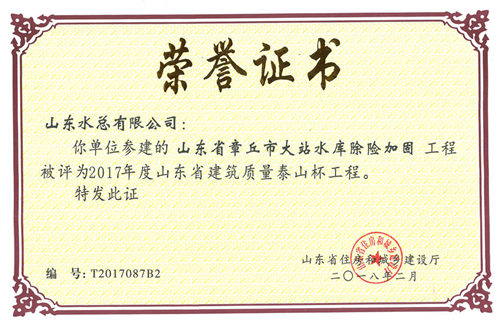 九州平台“山东省章丘市大站水库除险加固工程”荣获2017年度山东省建筑质量泰山杯
