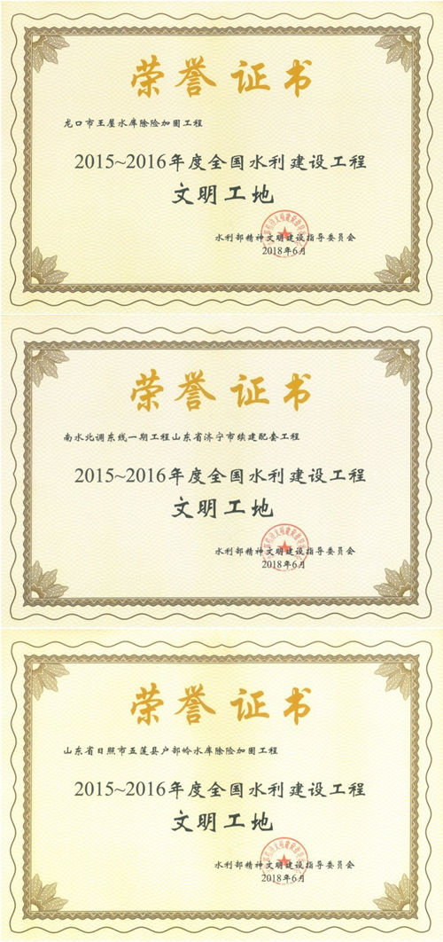 九州平台“龙口市王屋水库除险加固工程”等项目荣获“2015-2016年度全国水利建设工程文明工地”称号
