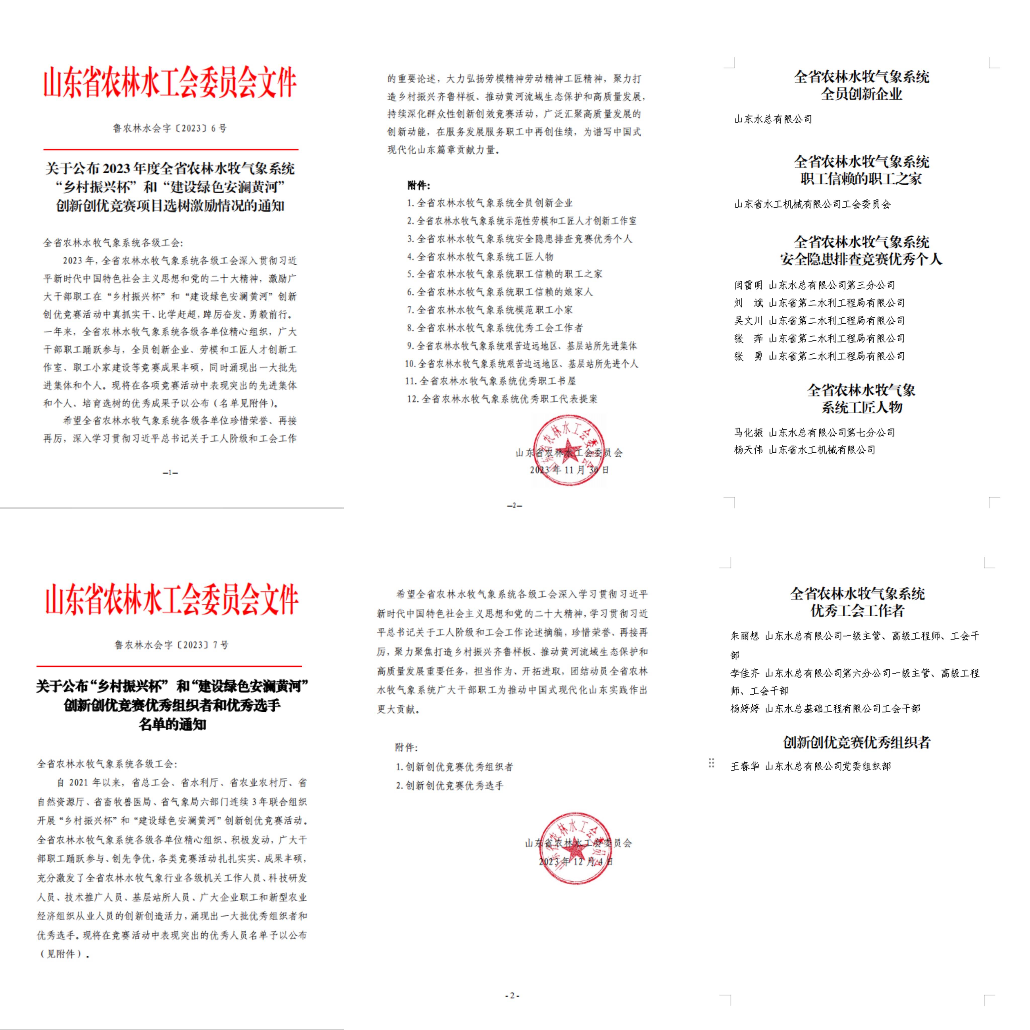 近日,山东省农林水工会下发了《关于公布 2023 年度全省农林水牧气象系统“乡村振兴杯”和“建设绿色安澜黄河”创新创优竞赛项目选树激励情况的通知》《“乡村振兴杯” 和“建设绿色安澜黄河”创新创优竞赛优秀组织者和优秀选手名单的通知》,山东水总荣获全省农林水牧气象系统全员创新企业,水工机械九州平台工会荣获“职工信赖的职工之家”,11人分别荣获“职工安全隐患排查竞赛优秀个人”“工匠人物”“优秀工会工作者”“创新创优竞赛优秀组织者”等称号。