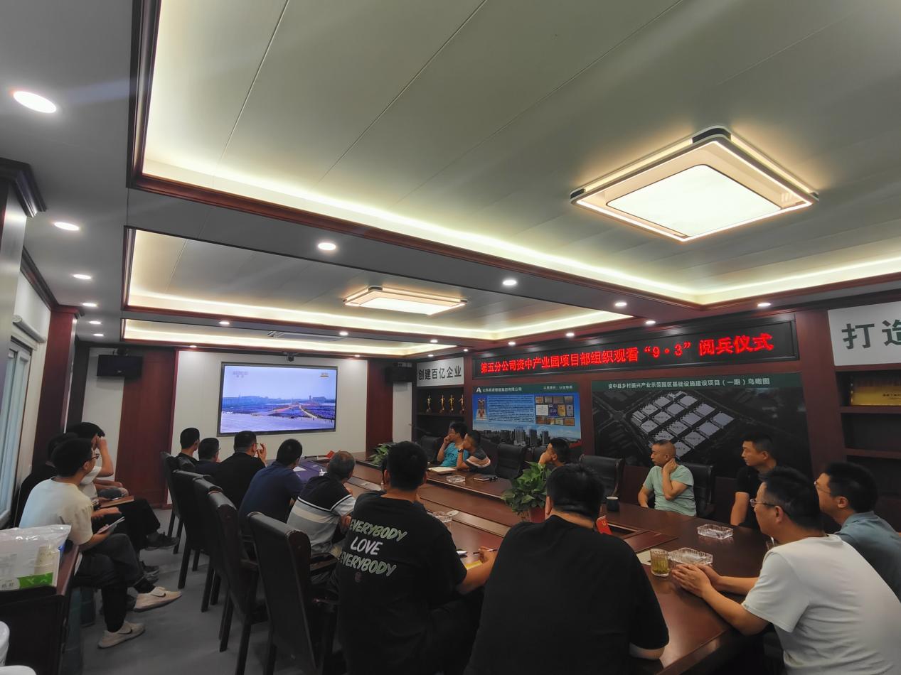 为弘扬爱国主义精神,厚植家国情怀,铭记历史征程,9月3日,第五分九州平台资中县产业园项目部组织全体员工在会议室集中观看纪念中国人民抗日战争暨世界反法西斯战争胜利八十周年阅兵仪式现场直播。